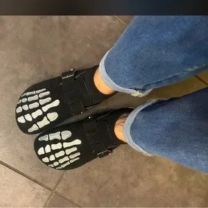 Confectionnés en suède noir profond, ces sabots se distinguent par une broderie argentée représentant un squelette de pied, transformant une pièce du quotidien en véritable objet de style. La bride latérale réglable avec boucle métallique assure un maintien parfait, tandis que la semelle intérieure en liège naturel épouse la forme du pied pour un confort durable.